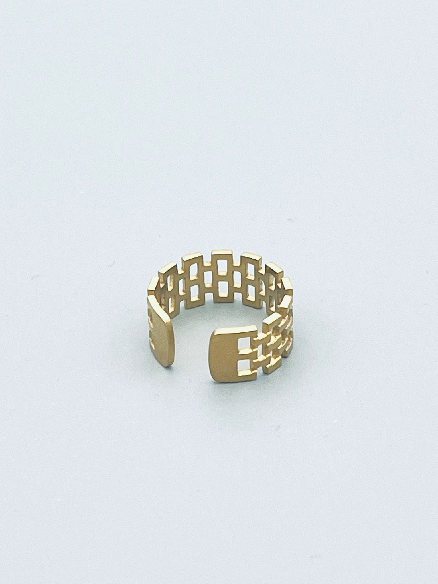 Mooie ring met band van schakels in goudkleurig roestvrij staal. Een fijne ring die mooi is op zichzelf, maar ook makkelijk is om te combineren. Verstelbaar en waterbestendig, ideaal voor dagelijks dragen én speciale momenten.