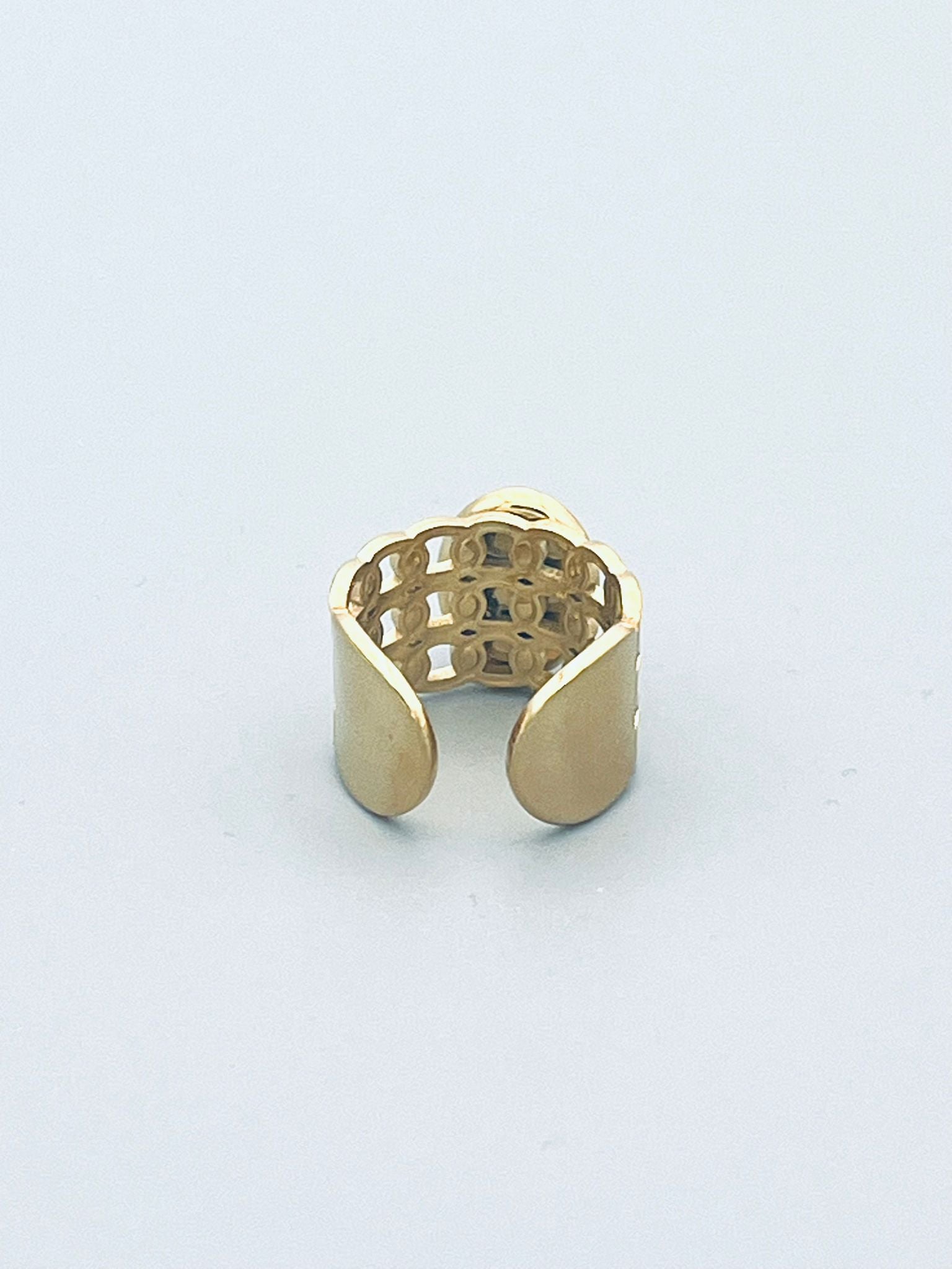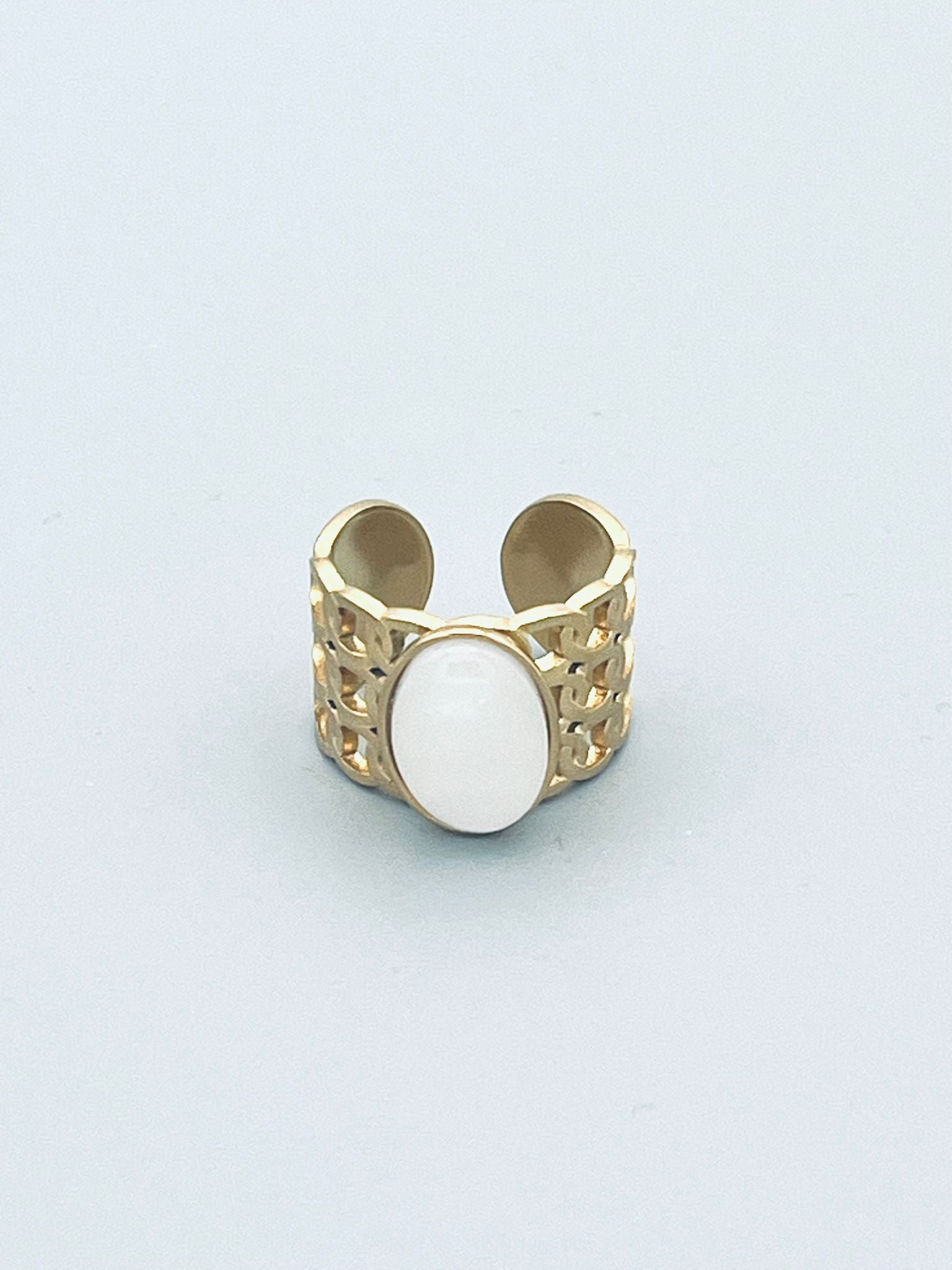 Deze brede ring met een grote steen is echt heel mooi! De ring is verkrijgbaar in goudkleurig roestvrijstaal met een kattenoog edelsteen in het bruin of een wit.