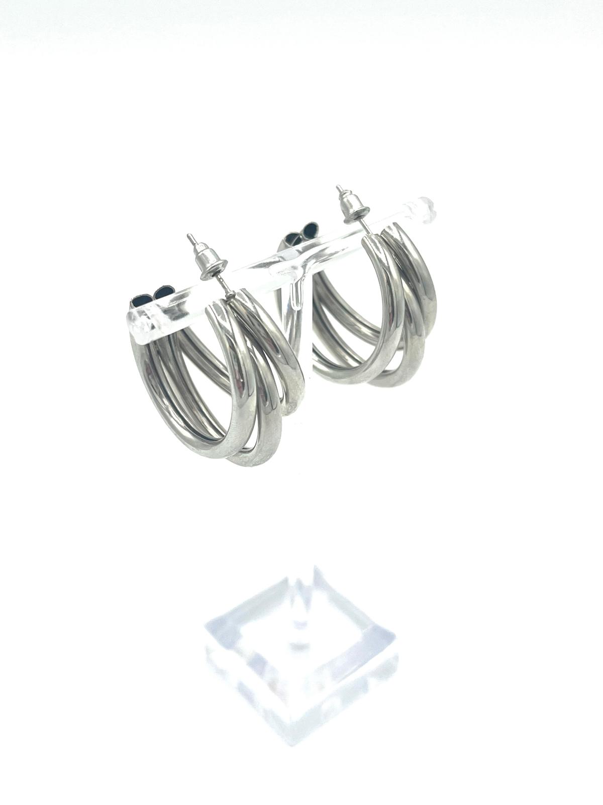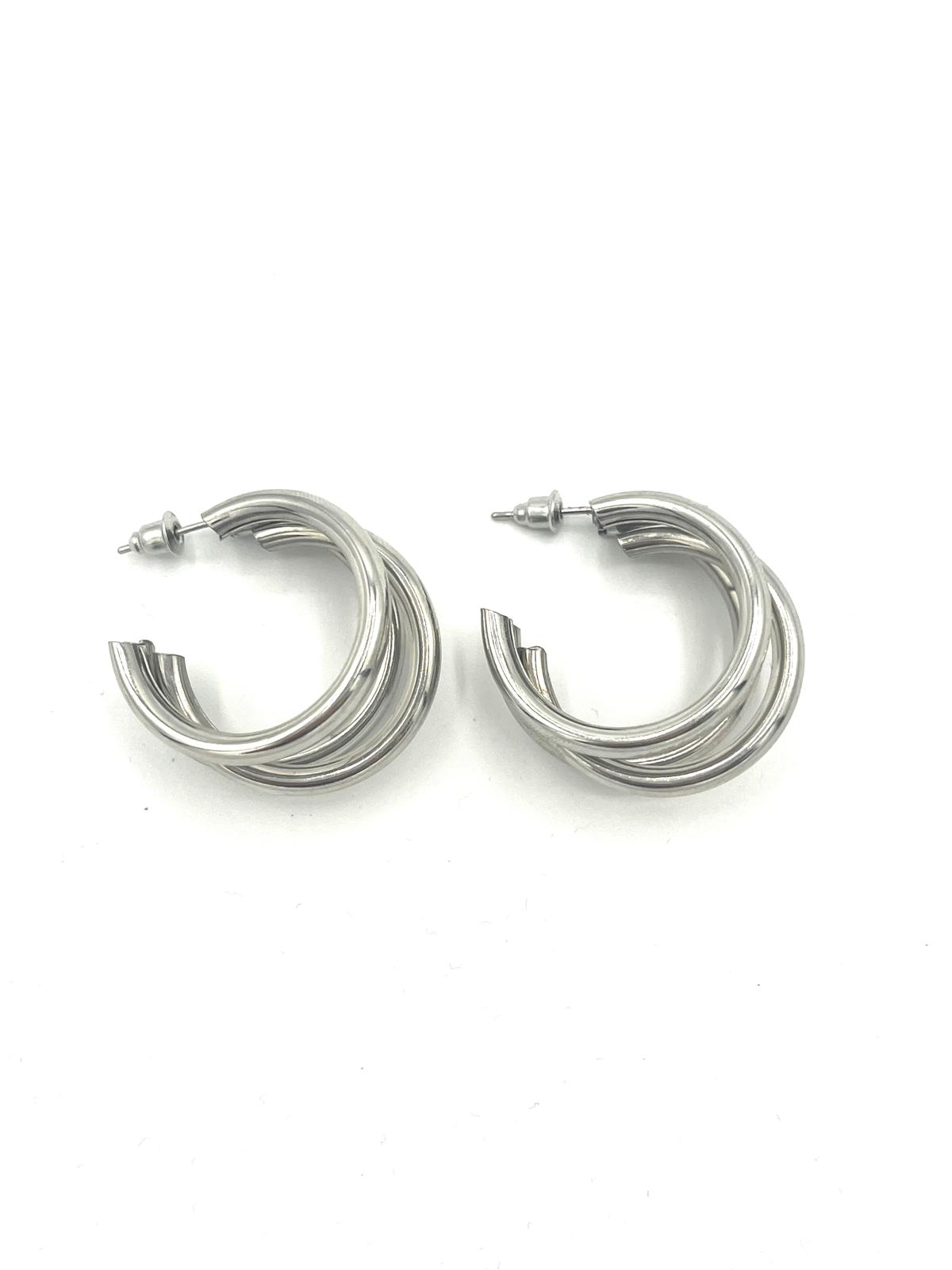 Deze grotere zilverkleurige oorbellen van roestvrijstaal zijn een opvallende statement toevoeging aan elke outfit. De drie elegante ringen zorgen voor een stijlvolle en moderne look. Perfect om je look direct een extra touch te geven, zowel bij casual als chique outfits.