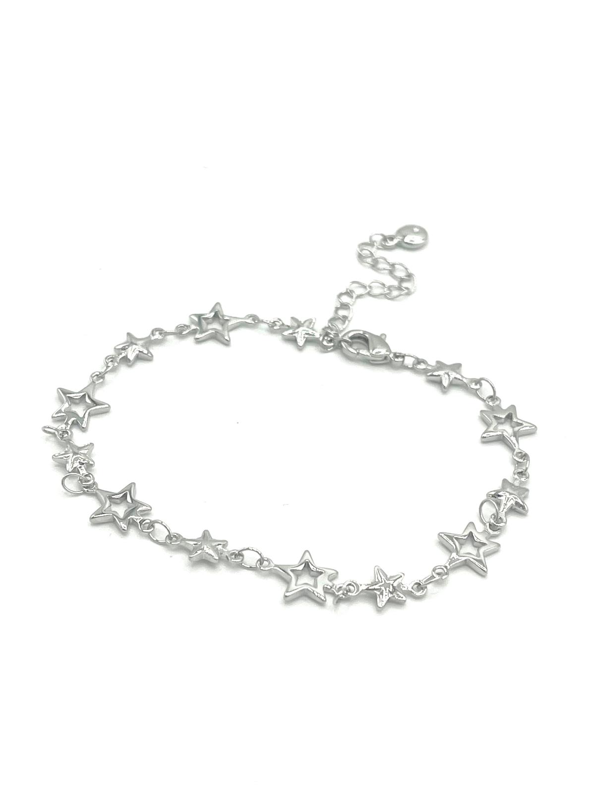 Deze zilverkleurige armband met subtiele sterretjes is een elegante toevoeging aan elke sieradencollectie. De afwisseling van open en dichte sterretjes zorgt voor een speels en verfijnd effect dat moeiteloos bij elke look past. Perfect om solo te dragen of te combineren met andere armbanden voor een stijlvolle armparty.