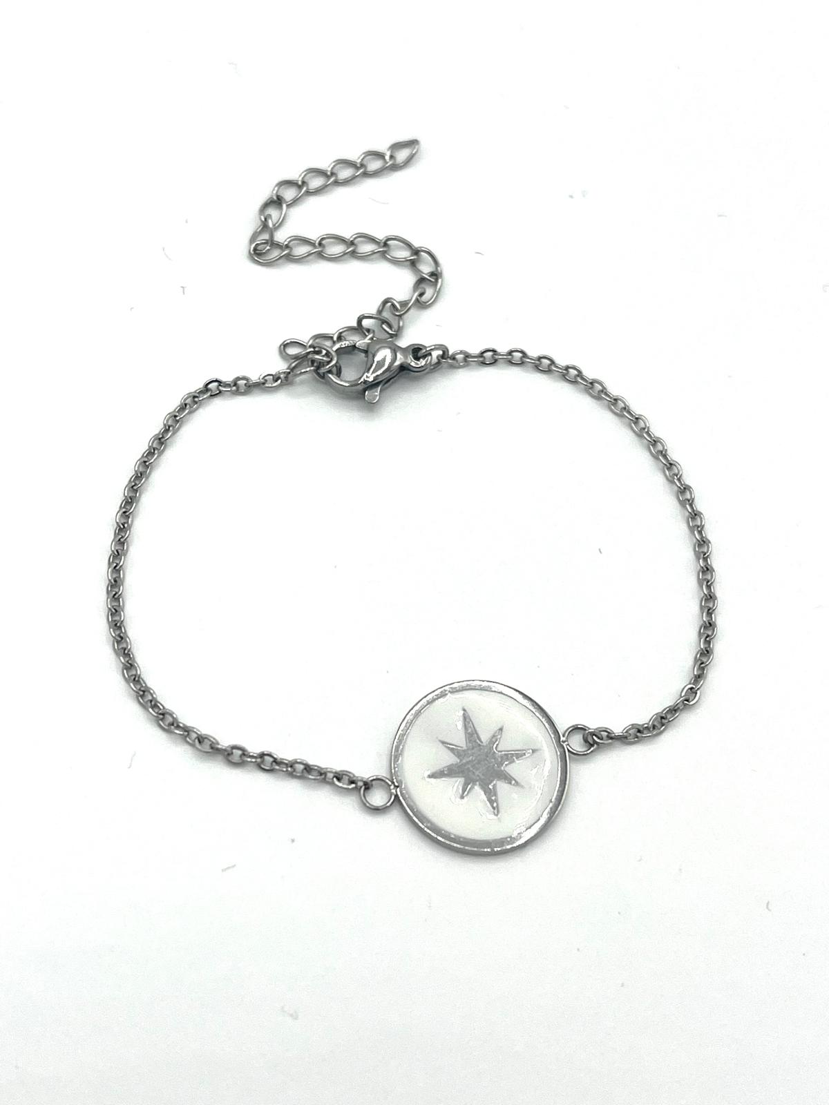Een subtiel sieraad met een vleugje betekenis. Deze zilverkleurige armband is gemaakt van hoogwaardig roestvrij staal en heeft een wit rond plaatje met een elegante zilveren ster. Het minimalistische design straalt rust en stijl uit, perfect om dagelijks te dragen of te combineren met andere sieraden.